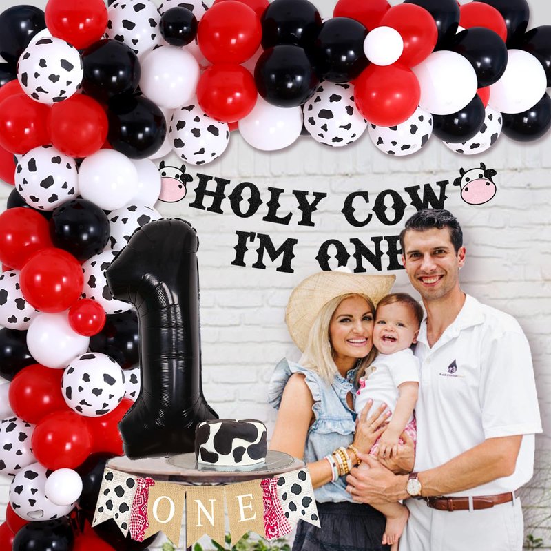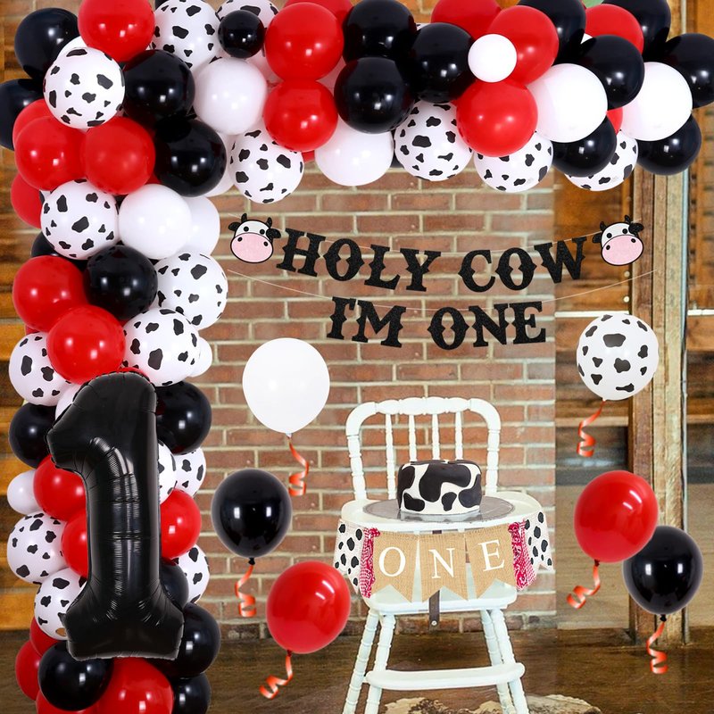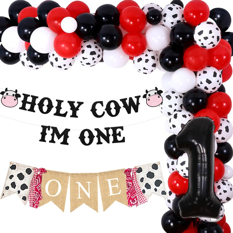 - Special Design: holy cow I'm one birthday decorations feature a delightful swallowtail banner and a “HOLY COW I'M ONE” birthday banner that incorporate cute and sparkling elements. The cow birthday balloon garland kit comes in red, black, and white, making it perfect for highlighting your adorable boy or girl's precious first birthday party.