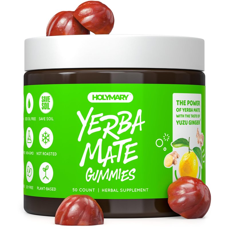 HOLYMARY Yerba Mate Gummies, Yuzu & Ginger - Made with Organic, Unroasted Yerba Mate. Free from Added Caffeine. Vegan, Non-GMO, Gluten-Free, Kosher. 50 Delicious Supplement Gummies