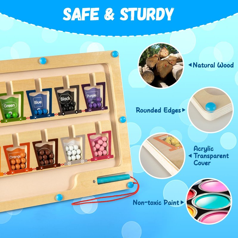 - 【Safe Materials & Easy to Carry】Our montessori maze toys for kids are made of high quality and safe natural wood, acrylic and magnets, which are sturdy, durable and smooth without hurting your hands! The permanently sealed top keeps the beads from falling out and kids are easy to put the magnet color number maze in the backpack. You can take it to restaurant, car, airplane and more, keeping your kids busy and quiet on long road trips.