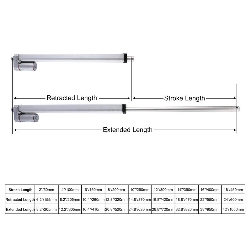 - ★ Specification: Stroke length = 50mm(2"); Retracted length = 155mm(6.2"); Extended Length= 205mm(8.2"); Travel speed = 0.39 inches/sec (10 mm/s);Maximum current draw = 3Amps; Maximum Load = 225lbs(900N). (After connecting the installation brackets at both ends, the actual length will increase by a few inches. If you have strict size requirements, please carefully consider the bracket size)
