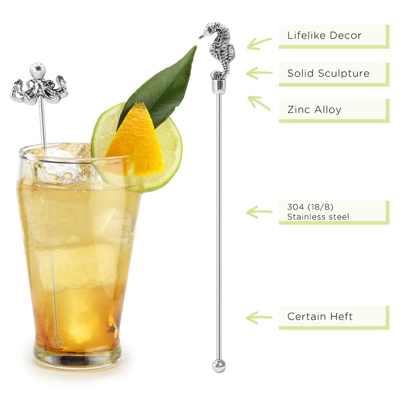 - CUTE BEVERAGE STIR STICKS: This 6 pcs set 7.5" coffee stirrer are our Sea Life series bar tools, with meticulously crafted 3D sculptures - shell, fish, seahorse, sea star, sea turtle and octopus. Great addition to complete your home bar collections, an excellent gife for those who loves nautical elements or Western and Mexican decor.