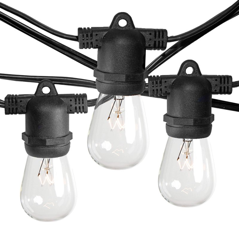 - This outdoor string lights set includes one commercial grade 50ft black outdoor light string and 25 S14 Clear glass light bulbs.