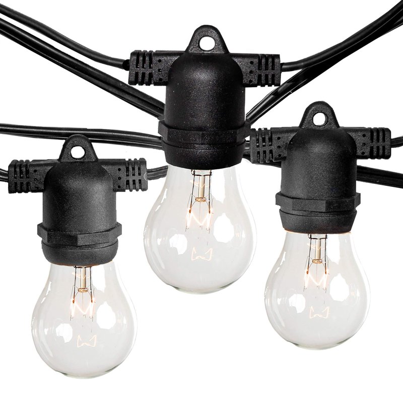 - This outdoor patio string lights set includes one commercial grade 50ft black outdoor light string and 25 A15 Clear glass light bulbs.