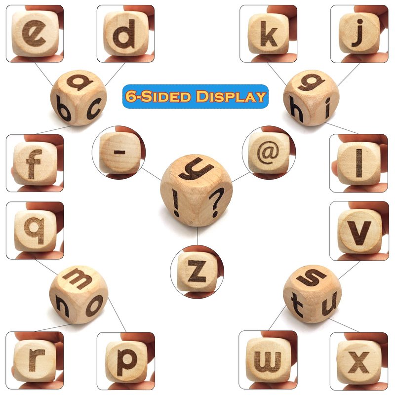 - Dice Set Content: Each set of dice set consists of 5 wooden dices and a linen bag; The display surface of each dice is engraved with the following contents: Dice1: a b c d e f; Dice2: g h i j k l; Dice3: m n o p q r; Dice4: s t u v w x; Dice5: y ? ! @ - z; It contains all lowercase English letters and 4 Common symbols.