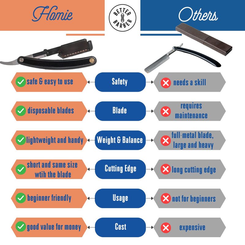 - EXTRA PROTECTION, EXTRA SAFE: The Homie razor adds an extra layer of blade protection that no other shavette straight razor brand offers right out of the box. Our invention of shaving razor has made it possible for you to shave closely and cleanly at home without worrying about causing any skin rashes or infections.