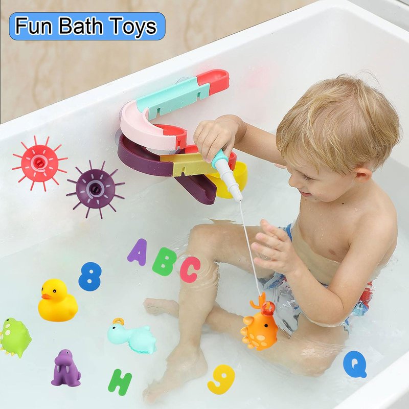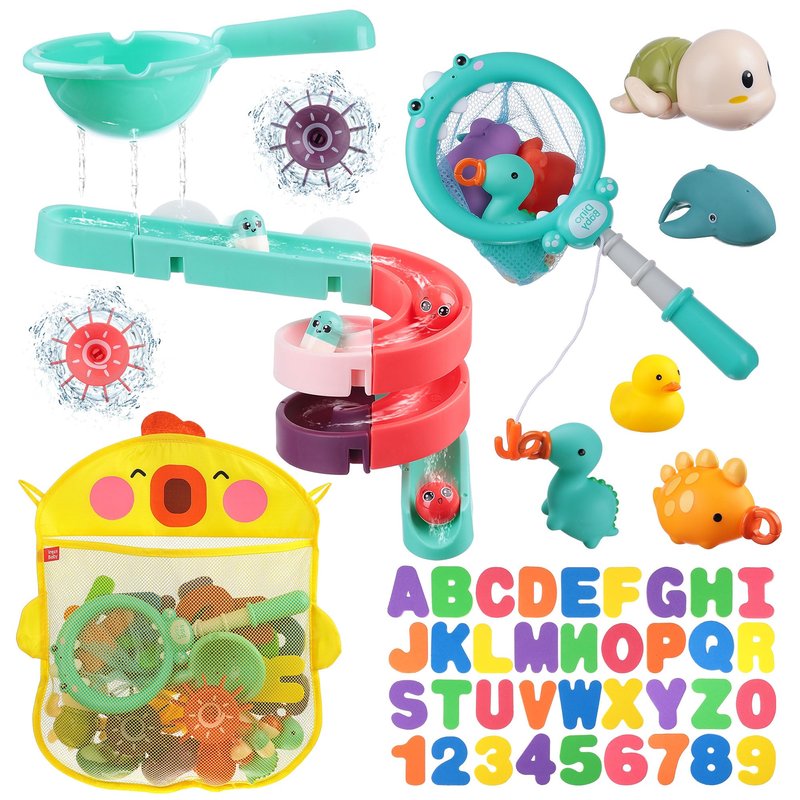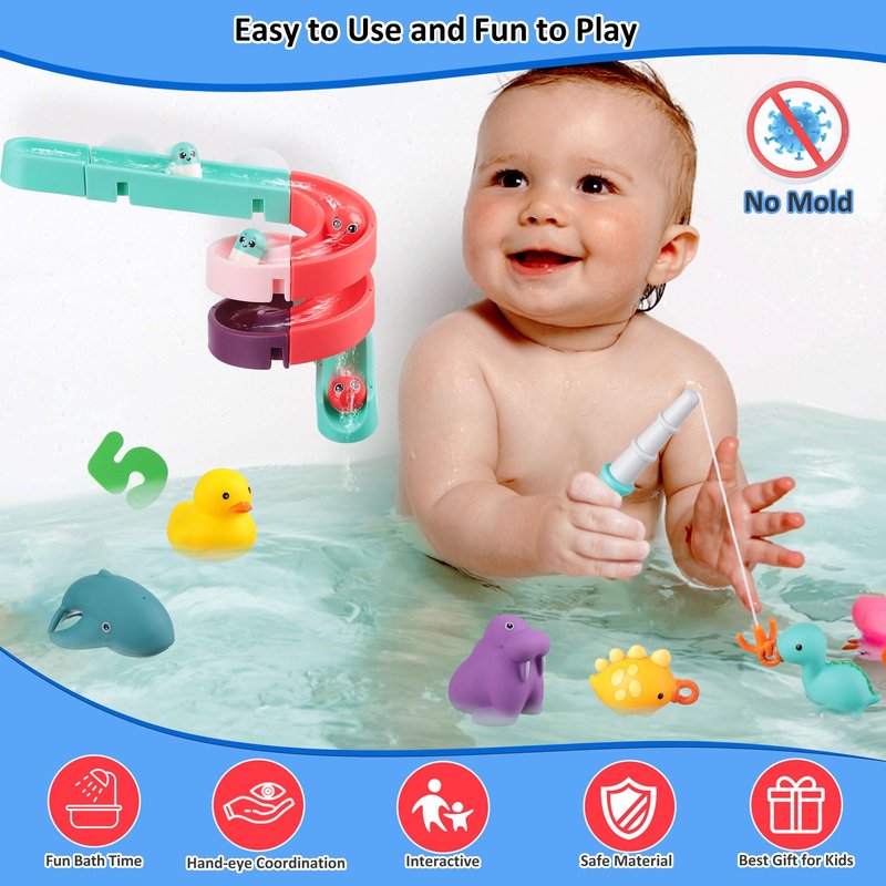 Exciting Play Options: Let your child's imagination run wild with our interactive slide bath toys and fun fishing game. Watch as colorful balls slide into the bathtub or wind up the turtle and enjoy watching it swim. Dive into a fun fishing game with specially designed dinosaurs and enhance your child's confidence and patience.
