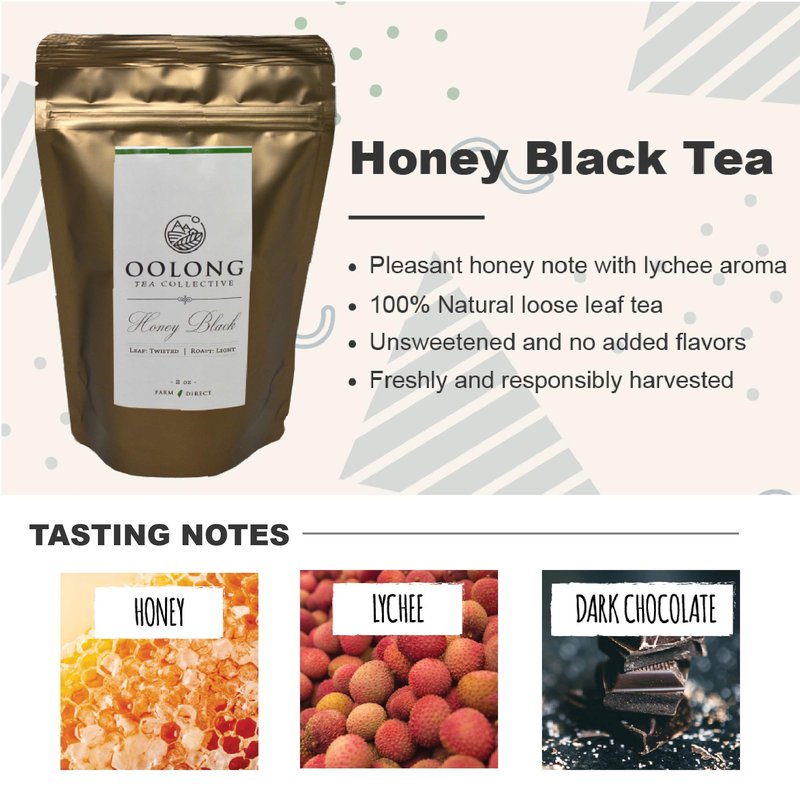 2022 HONEY BLACK TEAOrigin: Nantou, TaiwanElevation: 1,300 Ft.Flavors: Honey, Lychee, LonganCharacteristics: Natural honey note with lychee undertone and a hint of forestOur tea comes in a resealable zipper bag, which prolongs the storage life of the tea by protecting it from humidity and air.WHAT IS HONEY BLACK TEA?Honey Black Tea is a fully oxidized tea (100%). Thanks to the Taiwan’s high elevation climate and geographical condition, the tea plants are able to develop a natural honey aroma that is not found in any other black teas in the market.ABOUT THE BRAND - Oolong Tea CollectiveHONESTY OVER HYPEAs the world’s food economy is dictated by synthetic additives and engineering costs, we are tired of following the status quo. Oolong Tea Collective is to challenge the untold truth of food source through transparency, conquer price wars with authenticity and overcome flavor engineering by sourcing farm-direct.OUR MISSIONWe have embarked on a journey to bring you tea direct from its roots, without dilution, processing or flavor engineering. A simple product, a simple truth and a responsibility to give back. Bringing the fruits of their labor to an audience that appreciates truth over marketing strategies and natural taste over science engineering. A tea that expels misty high-mountain air and sings to a tune of floral orchestra.ADDITIONAL INFOIngredients: Black Tea .Suggested Equipment: Gongfu Cha Tea Set or Ceramic/Glass Teapot, Tea Strainer/Infuser, and Teacups. Additional Benefits: High Antioxidant Tea. Healthy tea. Ideal for fitness goals. Yogi Tea. Tea Bulk. Everyday Unsweetened Healthy Tea. Relaxation Tea. Healing Tea. Instant and convenient like Organic Black Tea Bags, English Breakfast Tea, Earl Grey and Tea Keurig k cups.