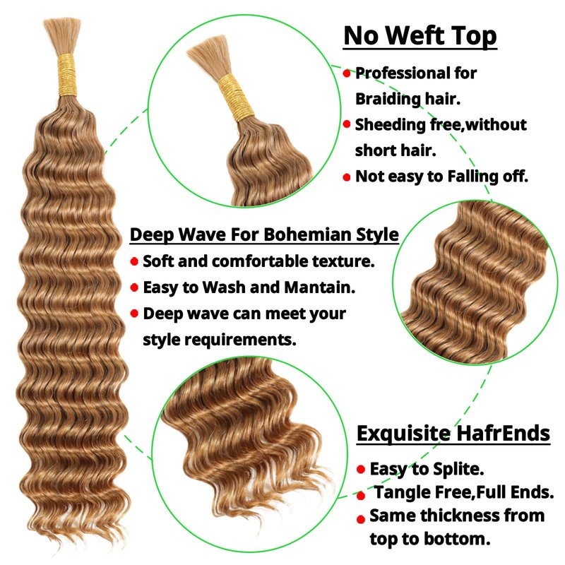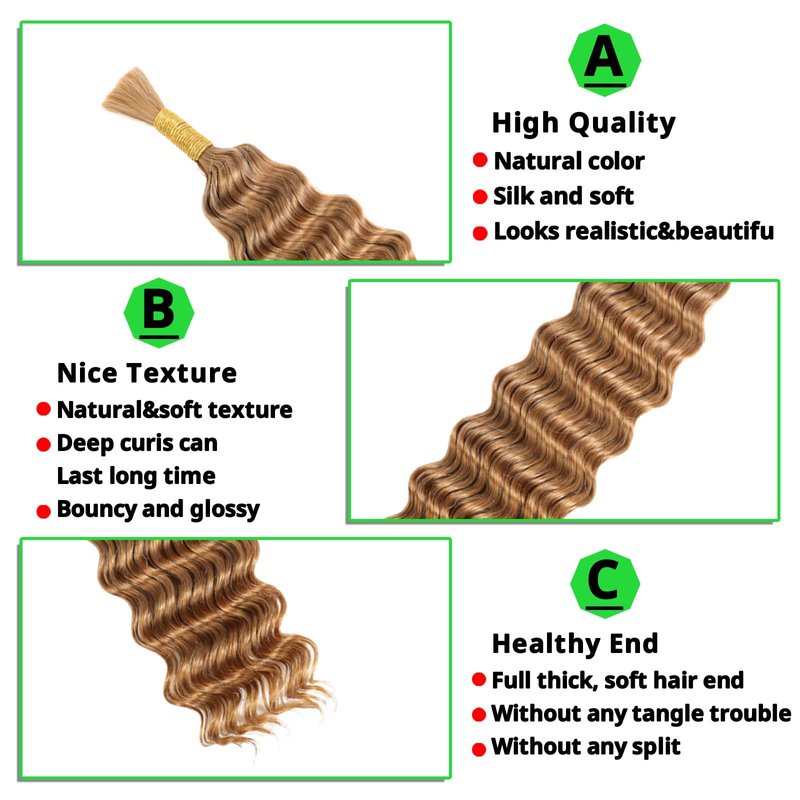 - 1. Hair Material: Deep wave Bulk Human Hair for Micro Braiding No Weft is made with 100% Raw and Unprocessed 12A Brazilian Virgin Human Hair. Cut off from one Young Donor Directly. Full Cuticle Intact and Aligned in the same direction.It's clean and soft, natural and healthy, bouncy and glossy, full and thick.