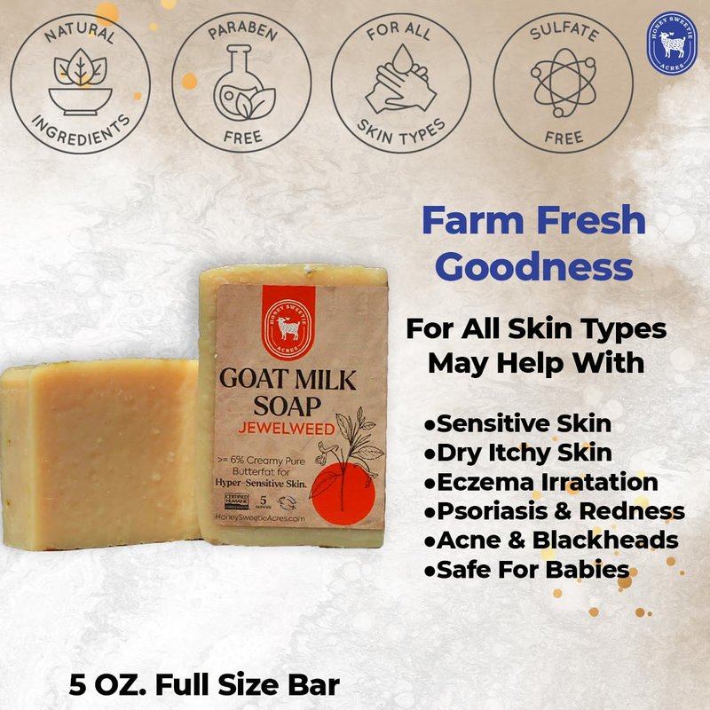 - Superior Poison Ivy & Rash Relief: Leveraging the natural power of Jewelweed and raw goat milk, our soap bar effectively soothes and reduces itching and irritation from poison ivy, oak, and sumac.