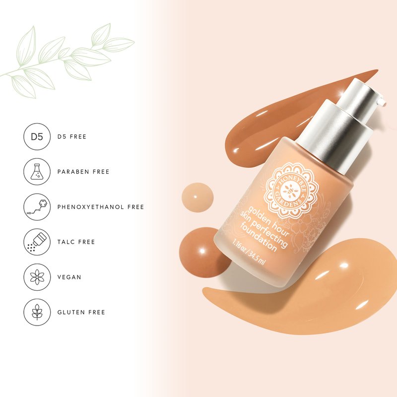 Introducing the enchanting Honeybee Gardens' Golden Hour Skin Perfecting Liquid Foundation - your key to capturing the coveted radiance of golden hour! Our luxurious formula effortlessly blends onto your skin, delivering a flawless, luminous appearance that'll make you feel like you're bathed in the warm, gentle embrace of sunset. This foundation is not only a treat for the eyes but also a treat for the skin. Enriched with selective actives, it provides the following benefits: Lycium Barbarum Fruit Extract helps retain moisture, promotes collagen production, and regenerates cells for a soft, youthful complexion Lupinus Albus Seed Extract stimulates high-quality collagen synthesis and enhances skin elasticity while boasting anti-inflammatory properties Sunflower Seed Oil offers non-comedogenic hydration and antioxidant protection, thanks to its rich concentrations of oleic acid, linoleic acid, and Vitamin E Sodium Hyaluronate provides deep moisturization and plumps the skin for a smoother, more supple appearance Committed to clean and conscious beauty, our foundation proudly states that it is D5-free, paraben-free, phenoxyethanol-free, talc-free, vegan, and gluten-free. Every shade has been thoughtfully curated to cater to a diverse range of skin tones, ensuring that everyone can find their perfect match. Discover the magic of Honeybee Gardens' Golden Hour Skin Perfecting Liquid Foundation and experience an unforgettable golden-hour radiance. Give your skin the love and care it deserves while looking utterly mesmerizing. So go ahead - indulge in this ethereal beauty and let your skin shine!