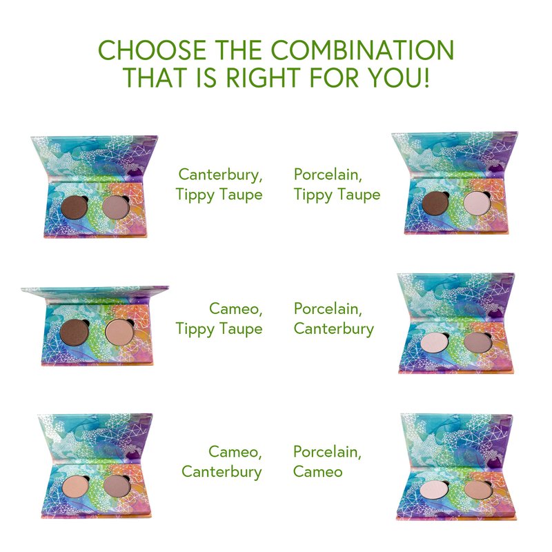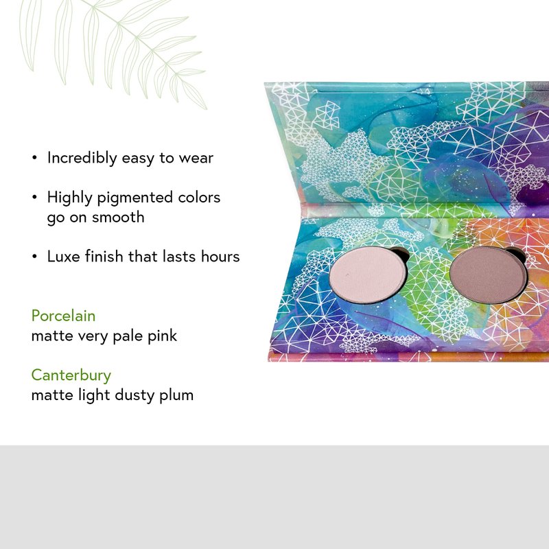 Features 2 of our most popular Pressed Eye Shadows included in our original ‘Skinny Dip’ Refillable Eye Shadow Palette (sold separately) in a gorgeous refillable compact. Our highly pigmented colors go on smooth, with a luxe finish that lasts hours. Gluten Free, Vegan, Cruelty Free, Paraben Free, Talc Free Made in Canada/USA Net Wt. 4 shadows at 1.3 g/0.045 oz each SET INCLUDES: Porcelain (matte very pale pink) Canterbury (matte light dusty plum)
