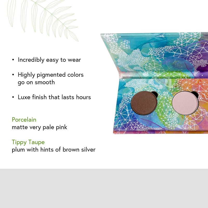 Features 2 of our most popular Pressed Eye Shadows included in our original ‘Skinny Dip’ Refillable Eye Shadow Palette (sold separately) in a gorgeous refillable compact. Our highly pigmented colors go on smooth, with a luxe finish that lasts hours. Gluten Free, Vegan, Cruelty Free, Paraben Free, Talc Free Made in Canada/USA Net Wt. 4 shadows at 1.3 g/0.045 oz each SET INCLUDES: Porcelain (matte very pale pink) Tippy Taupe (plum with hints of brown silver)