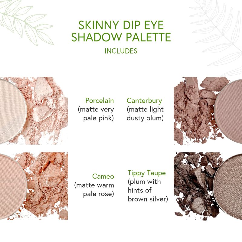 Introducing the Honeybee Gardens Skinny Dip Eye Shadow Palette: your go-to collection for natural, yet stunning looks. Expertly curated with four universally-flattering shades, this palette is the perfect companion for creating dynamic and eye-catching styles - ranging from romantic and minimalistic to bold and daring. The palette includes: Porcelain: matte very pale pink Cameo: matte warm pale rose Canterbury: matte light dusty plum Tippy Taupe: plum with hints of brown silver Infused with natural ingredients, our eye shadow is gluten-free, vegan, and paraben-free - making it an ideal choice for beauty enthusiasts who value quality and care about their skin. The ultra-smooth, highly pigmented formula ensures a lasting, luxurious finish that won't fade or crease throughout the day. Going green has never been easier, thanks to our innovative refillable eye shadow compact. Not only is it environmentally friendly, but it also ensures cruelty-free shopping by reducing waste and prioritizing responsible sourcing. When selecting your makeup, it's essential to choose brands you can trust. At Honeybee Gardens, we've got you covered with our certified gluten-free, vegan, cruelty-free, and talc-free eye shadows. Embrace beauty with confidence, knowing you've made a wise decision for your skin and our beautiful planet. Experience the magic of Honeybee Gardens Skinny Dip Eye Shadow Palette and elevate your beauty game with eye-catching looks that last all day. Order yours today!