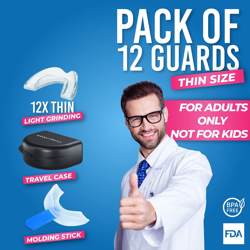 - 12 Pack of Thin: 12 mouth guards in total to last you a long time. A thinner size for light grinding