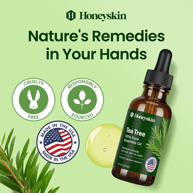 Honeyskin 100% Pure and Natural Tea Tree Oil - Hair Growth Oil and Scalp treatment - Tea tree essential oil for Face, hair, and skin - Aromatherapy essential oil diffuser 1fl.oz (29ml)