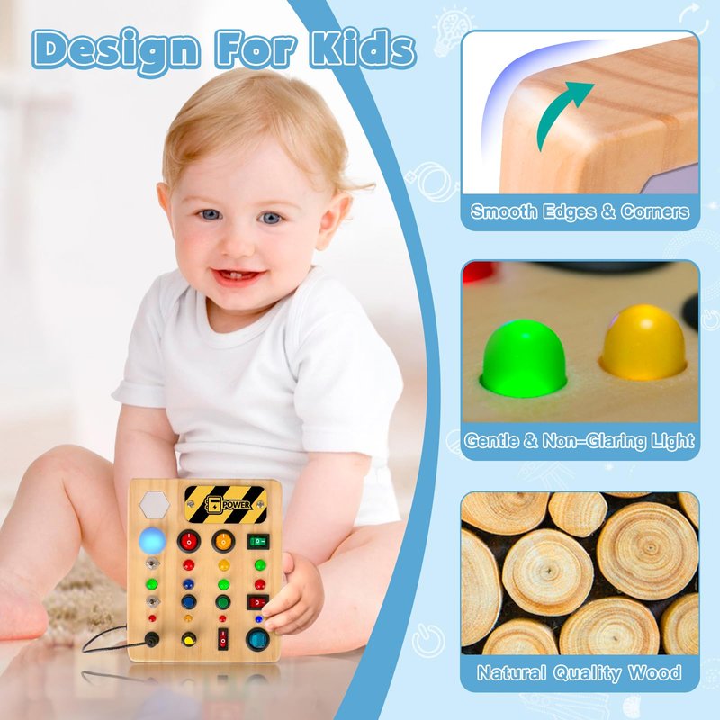 - 💡【12 LED + 12 Buttons Light Up Busy Board】Light switch board includes different colored and sized lights and buttons that can improve kids' sustained concentration and perception of cause and effect. Baby busy board needs 2 AAA Batteries (Not Included)