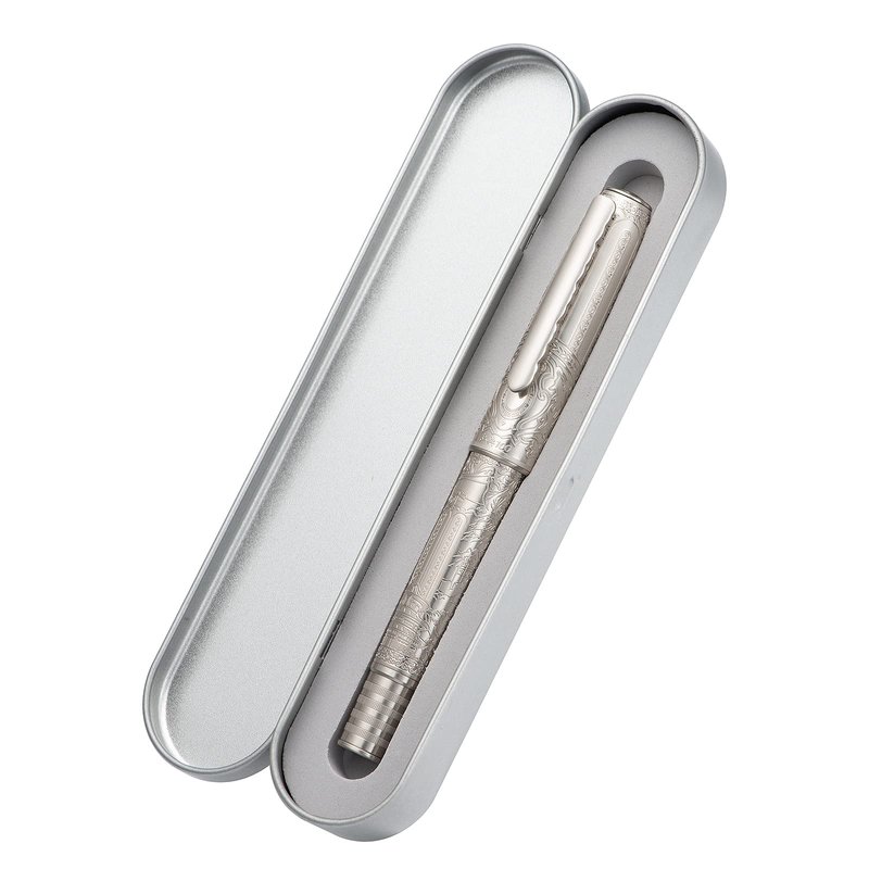 Hongdian 100 Piston Fountain Pen Silver Steel, Iridium Medium Nib Calligraphy Pen, Smooth Writing Pen with Pen Case Set