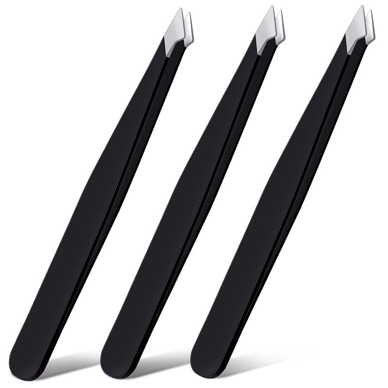 Features: What you get: You will receive 3 pairs of tweezers in this package, sufficient number is enough for you to use and replace, easy to meet your multiple cleaning needs. How to use: Cleanse treatment area thoroughly with warm water and apply a warm, moist, clean towel over the area for 10-15 minutes before use. Clean the area of your skin you intend to treat and to clean the tool before each use. Specifications: Material: 430 stainless steel Color: black Size: as the pictures shown Package includes: 3 Pairs of eyebrow tweezers Notes: Manual measurement, please allow slight errors on size. The color may exist slight difference due to different screen display. Pointed items are included, please be careful when using and please keep them away from kids.