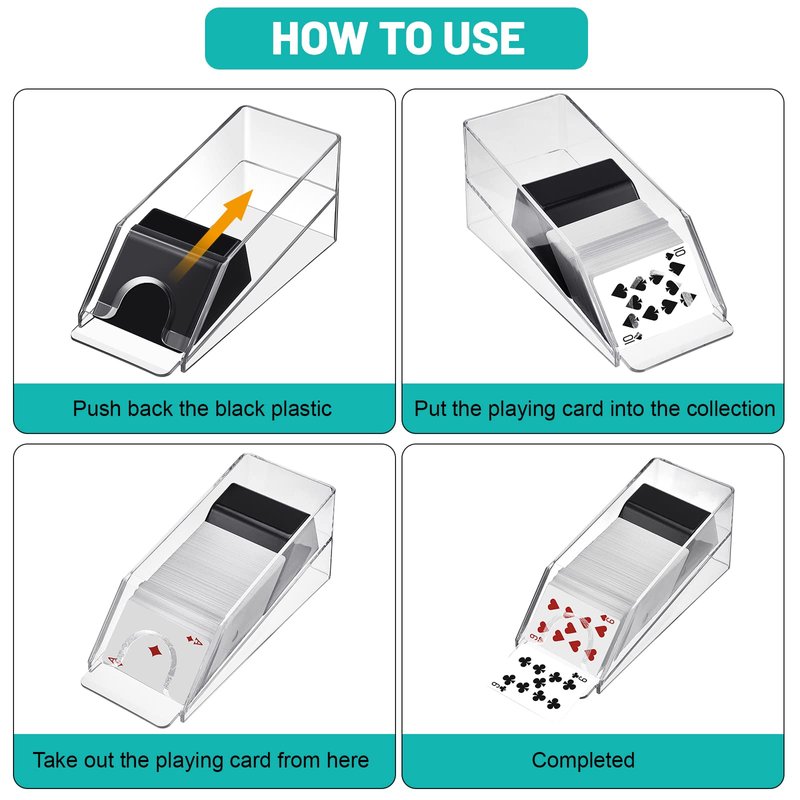 - Enough Capacity: our blackjack card shoe can store 4 deck standard playing cards, so you don't have to worry about too many cards that will not fit; Besides, playing cards are not included in the package, so you need to prepare your own cards to play
