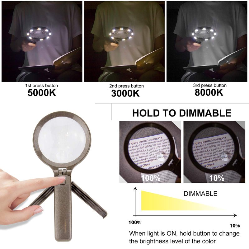 - ►[3 Lighting Modes Magnifier]--press the button switch to turn the light ON nature light/ warm light/ cool light /OFF .Hold the button to dimmable the brightness level.