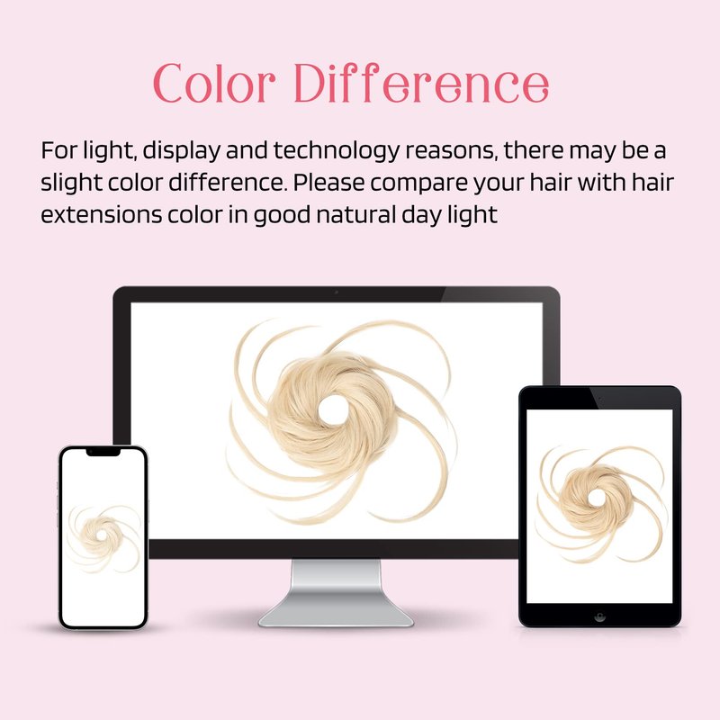 - Please Note: Due to the screen resolution settings, you may see some slight differences between the color tone of the hair extension in the photos and the actual hair bun scrunchies