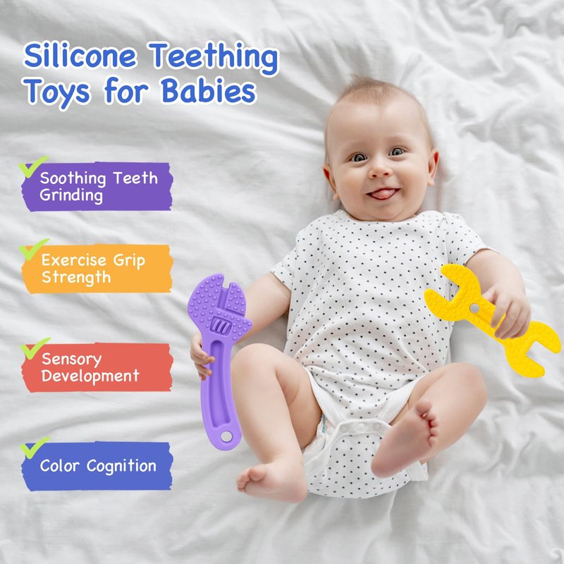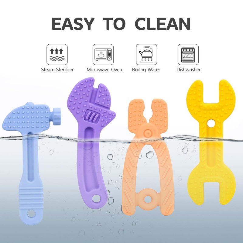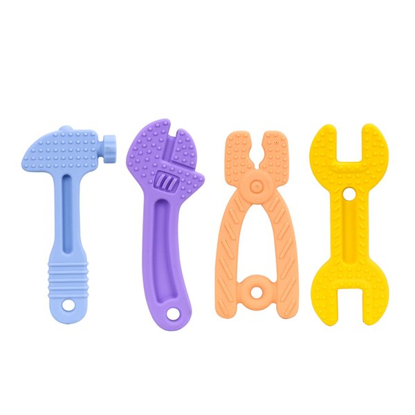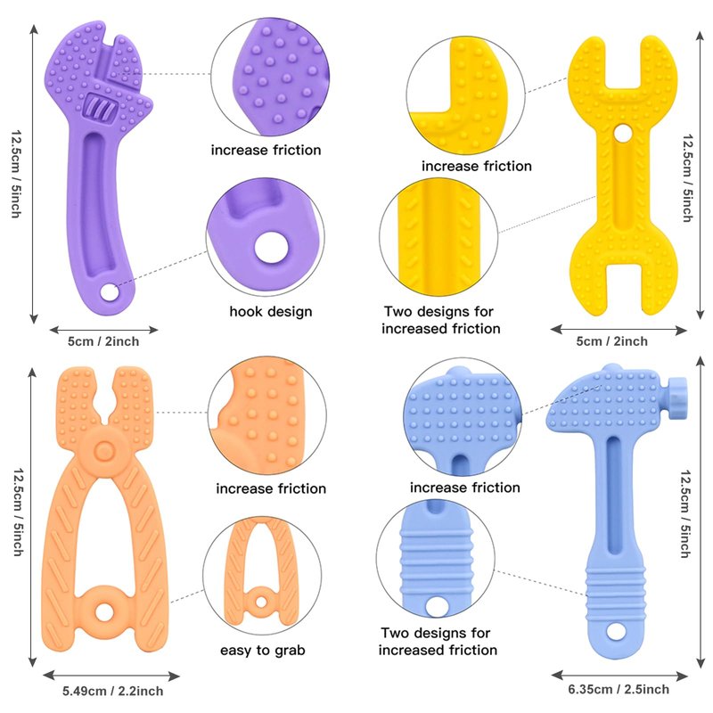 Hooku 4 Pack Silicone Teething Toys for Babies 0-6 Months, Teethers for Babies 6-12 Months, Hammer Spanner Wrench Pliers Tools Shape Sensory Chew Toys