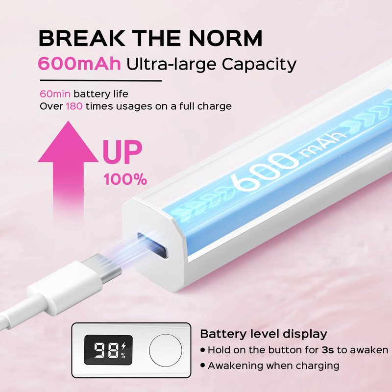 - LCD Digital Display: This nail cure light is Built in LCD screen displays remaining curing time and battery level in real time for convenience, just hold on the button for 3s to awaken it.
