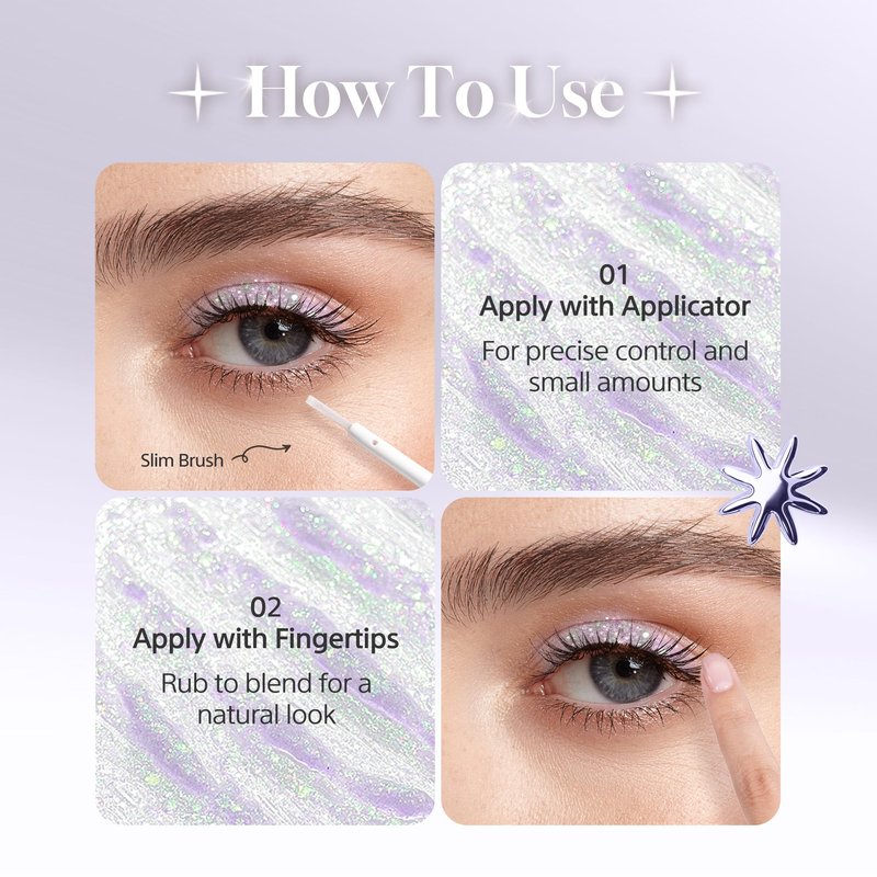 - VERSATILE AND EASY APPLICATION. The thin, sophisticated applicator allows for precise application, perfect for detailed soft girl makeup trend or as an eyeliner. This glitter eyeshadow can also be used on the body and lips, making it a versatile addition to your makeup. Glam up your look with a touch of glitter magic!