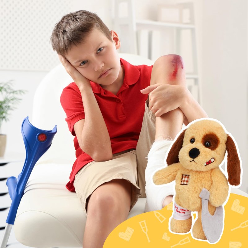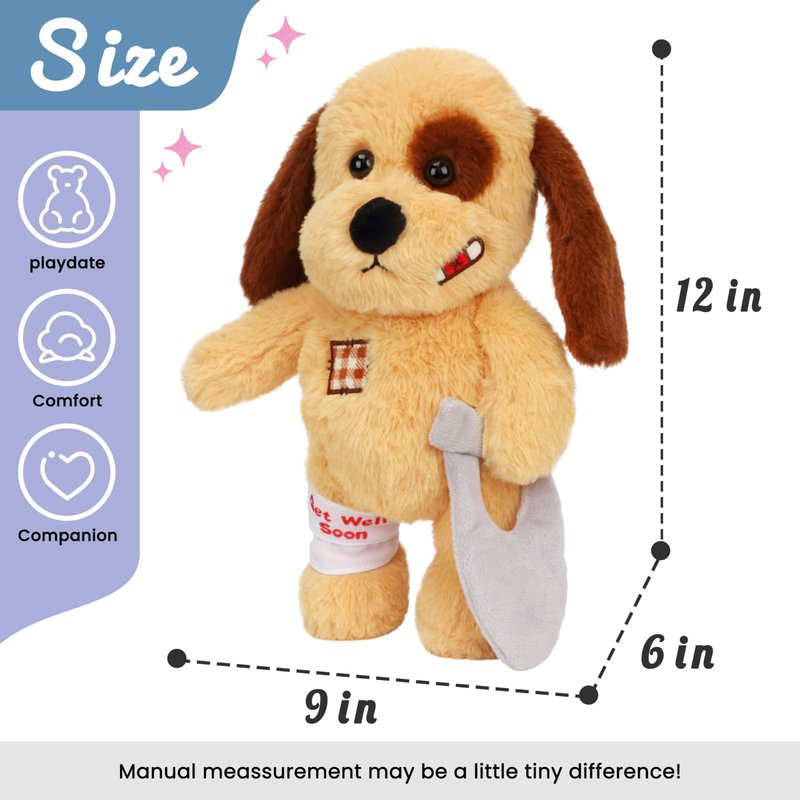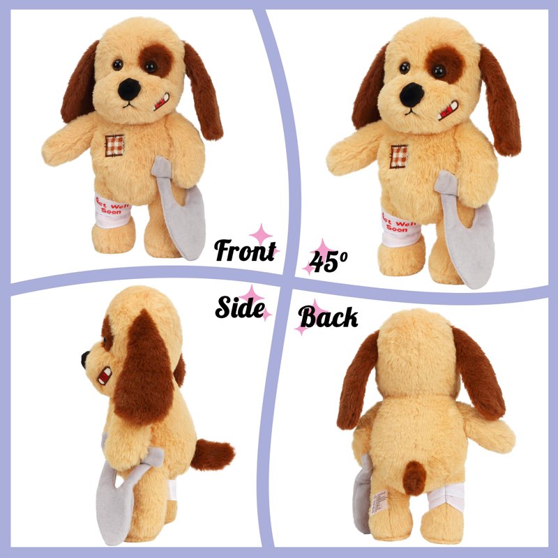Bring a smile to a child's face with this adorable stuffed puppy toy. Designed to provide comfort and companionship, this plush pup features a soft, huggable body and a removable cast on its leg, making it the perfect gift for kids recovering from an injury or illness. With its expressive eyes and floppy ears, this cuddly canine is sure to become a cherished friend. Measuring approximately 12 inches tall, it's the ideal size for little hands to hold and snuggle. Whether used for imaginative play or as a soothing presence during difficult times, this lovable plush pup is a heartwarming addition to any child's toy collection.