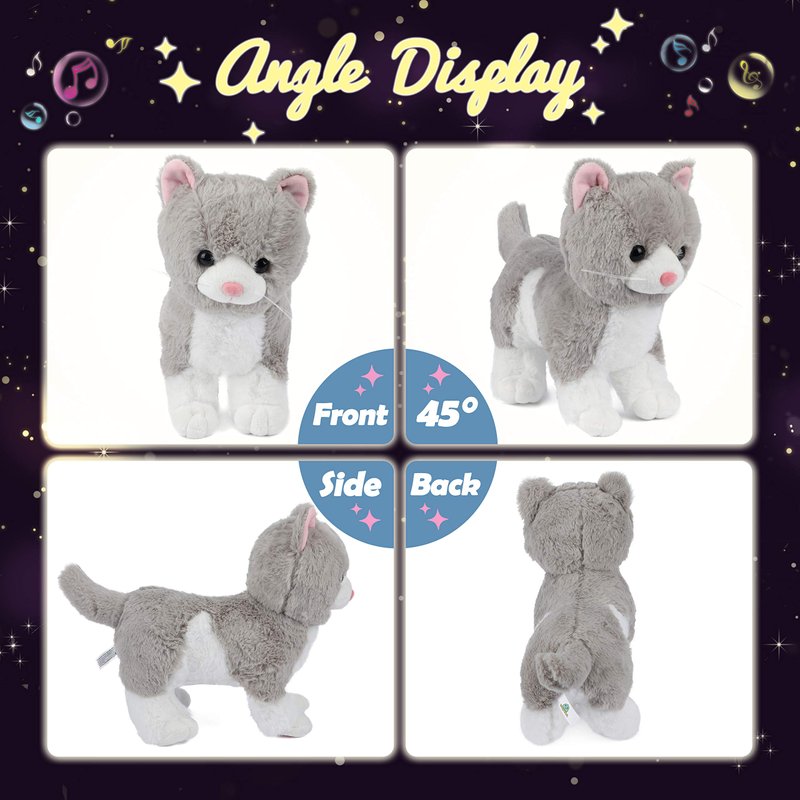 - EXTRA ADJUSTABLE VOLUME: There are three buttons on our plush cat. On the right paw of the cat, the switch control the light on or off. Press the ‘♬’ button on the other paw of the lovely kitty plush, cat will play the music, press again, it will stop, again, it will change to another song. The button embroidered with speakers is the switch to control the volume, includes 3 levels, you can adjust it as you like.