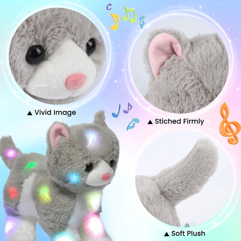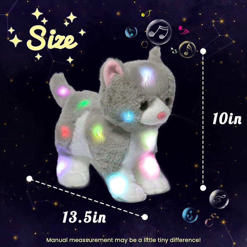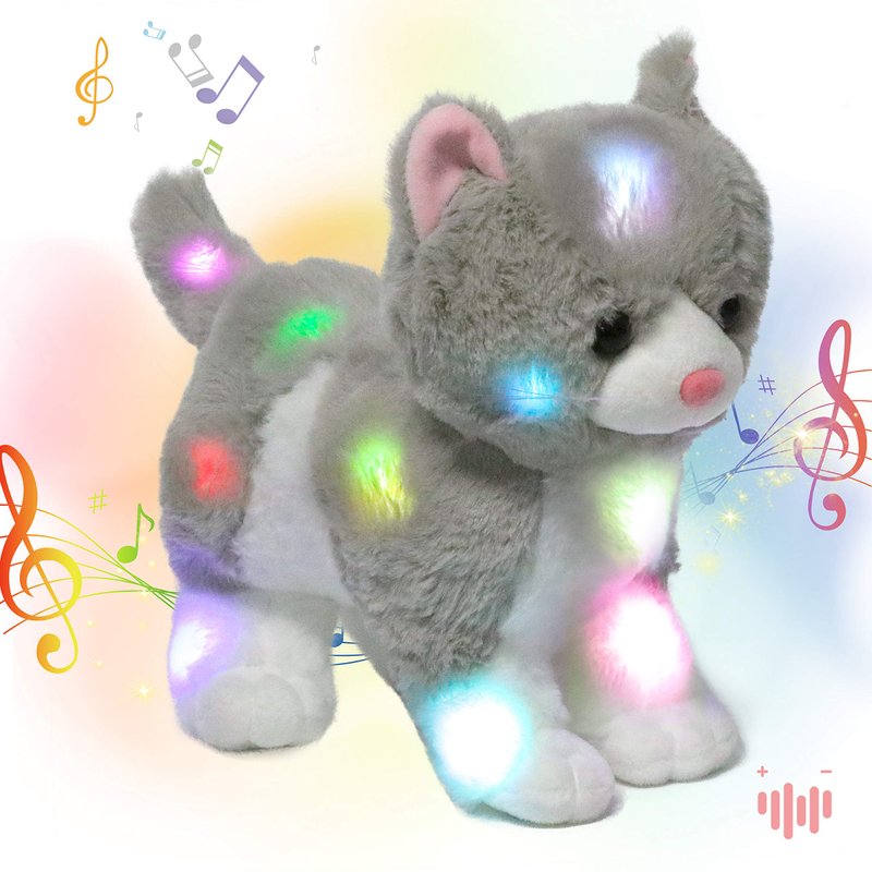 - MUSICAL LIGHT UP PLUSH: This stuffed animal glows in the dark. The magical cat features a soothing lullaby sound and a color-changing glowing effect. Light up your kid's dormitory and help reduce the anxiety caused by the dark in your little ones. There are 10 songs are contained. Your kids can learn to sing with it and will get much fun.