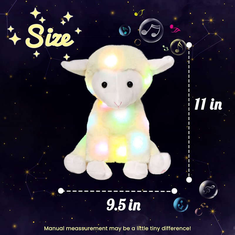 - MUSICAL LIGHT UP PLUSH: This stuffed animal glows in the dark. The magical lamb features a soothing lullaby sound and a color-changing glowing effect. Light up your kid's dormitory and help reduce the anxiety caused by the dark in your little ones. There are 10 songs are contained. Your kids can learn to sing with it and will get much fun.
