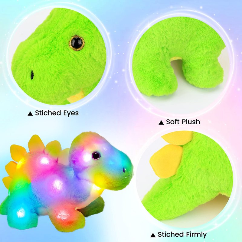 - CREATIVE COMPANION FOR KIDS: Equipped with colorful LED lights inside, this cozy dinosaur will glow in the dark when turned on and will comfort you. It also helps both kids and adults relax when taking a nap in the afternoon or accompanying those scared of dark during bedtime, which will help reduce anxiety and help them self-soothe in order for a better relax, so it's not just toy.