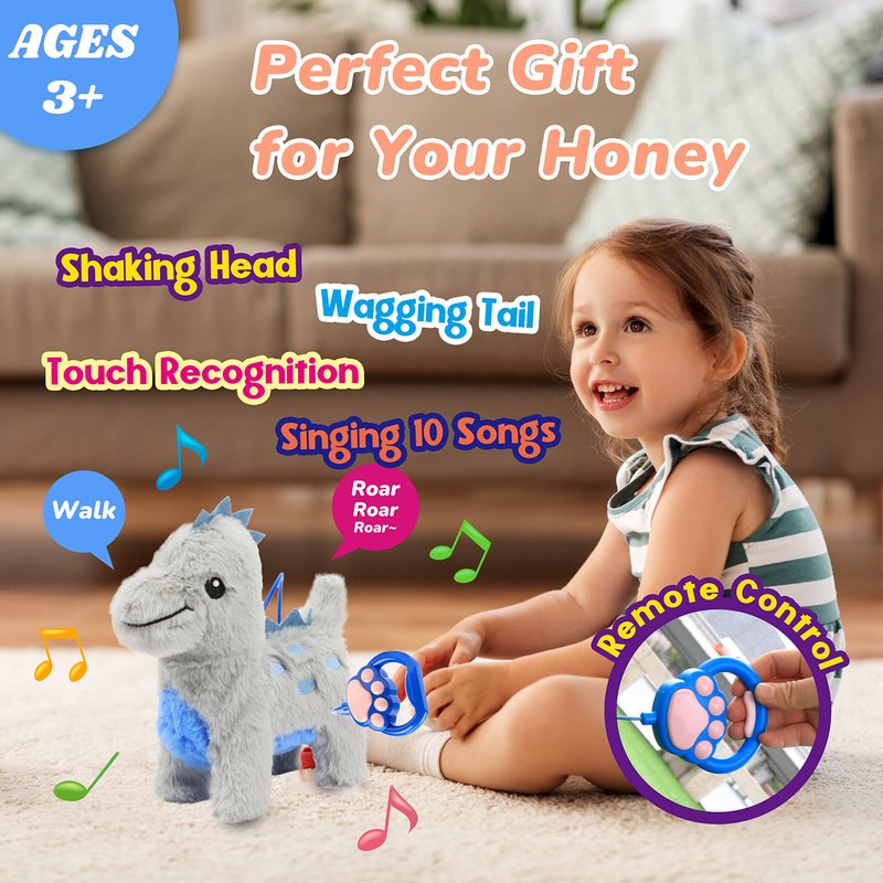 - A INTERESTING TOY FOR KIDS: Still buy some boring stuffed animals or dolls for your little one? Why not try this walking dinosaur? There is a walk function included along with simple touch recognition on the toys head that your child is able to operate with ease. The interactive dinosaur is also able to even bark, cry, node head and wag its tail! Perfect for a little one that loves animals.