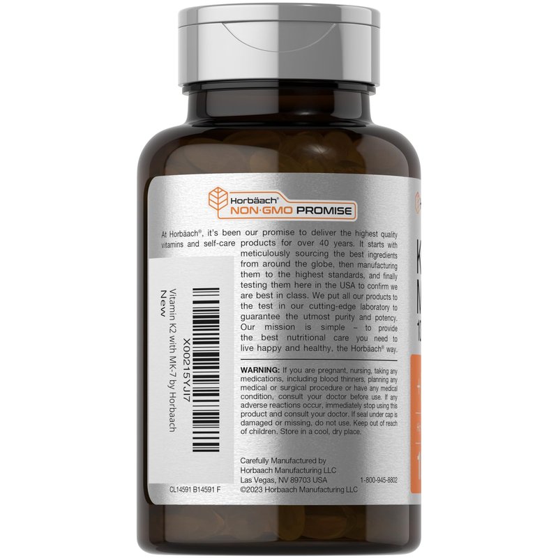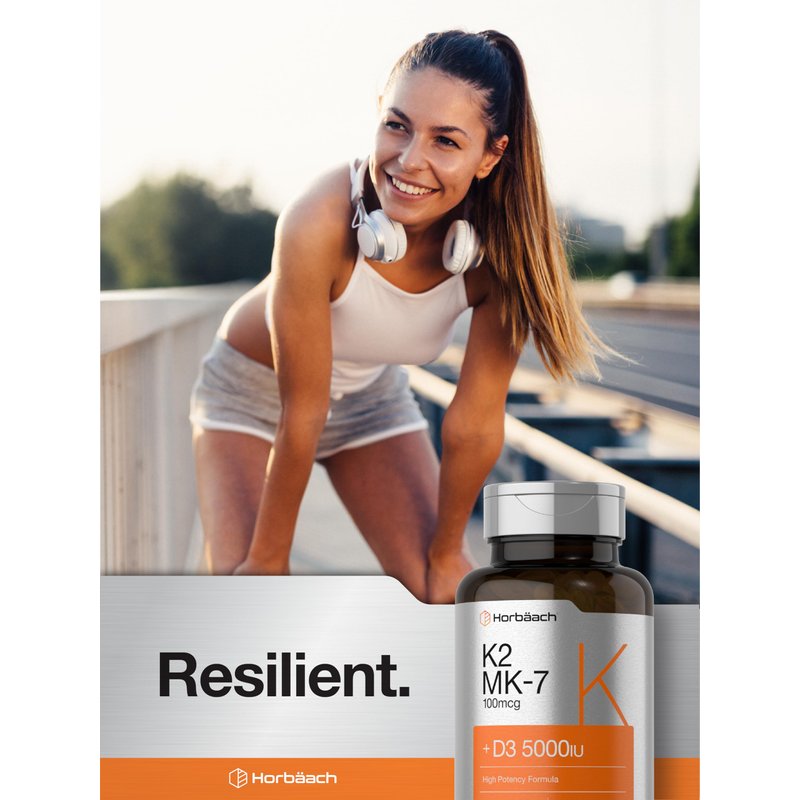 Experience the benefits of Horbaach Vitamin K2! Gluten free and non-GMO quick release softgels feature 100 mcg of Vitamin K (as Menaquinone-7 MK-7), plus 125 mcg (5,000IU) of Vitamin D3 for added support. Our high potency formula is free of artificial flavor, sweetener, and preservatives, making it a top supplement of choice for men and women everywhere!