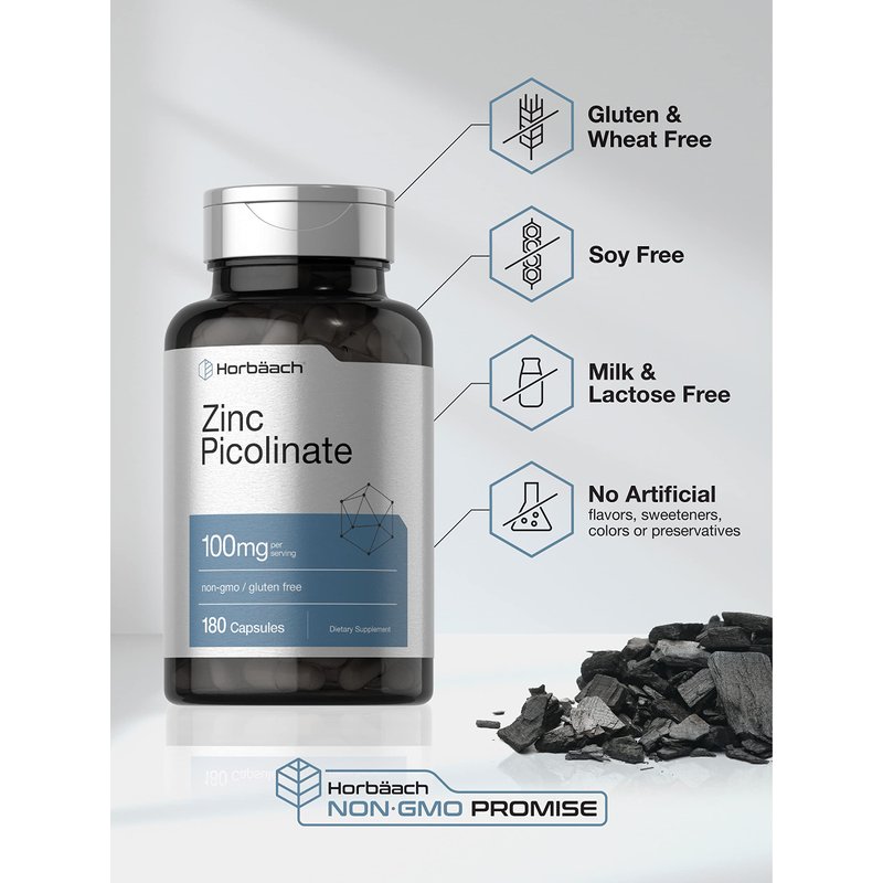 Horbäach Zinc Picolinate 100mg | 180 Capsules | High Potency | Non-GMO, Gluten Free | Zinc Supplement