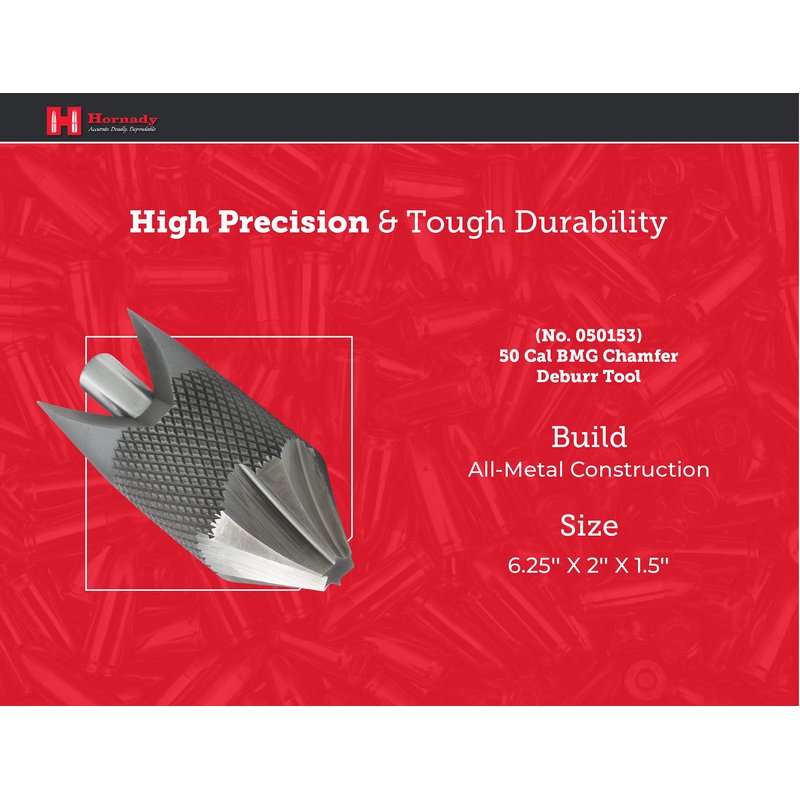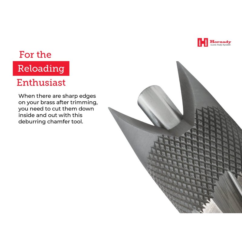 - Double-Ended Chamfer and Deburring Tool - keep your casings smooth and precise with this single piece all tool steel Hornady 50 Cal Deburring Tool 050153. This handheld tool has a knurled center section to provide a comfortable gripping surface