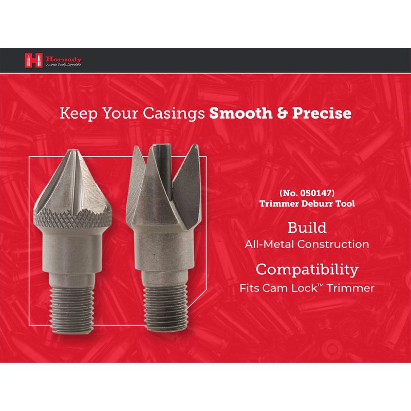 - Chamfer and Deburring Tool - keep your casings smooth and precise with the Hornady Cam Lock Trimmer Deburr Tool 050147. It mounts in place of the cutter on the Hornady Cam-Lock Trimmer to speed the chamfering and deburring process