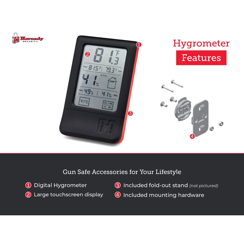 - Gun Safe Accessories for Your Lifestyle - further protect and preserve your firearms as they are being stored with this efficient Hornady Safe hygrometer. Optimal for all of your small spaces including gun safes, workbench, gun locker, rifle safe, hard case, gun bag, closets, cabinets, cars, RVs, boats, and more