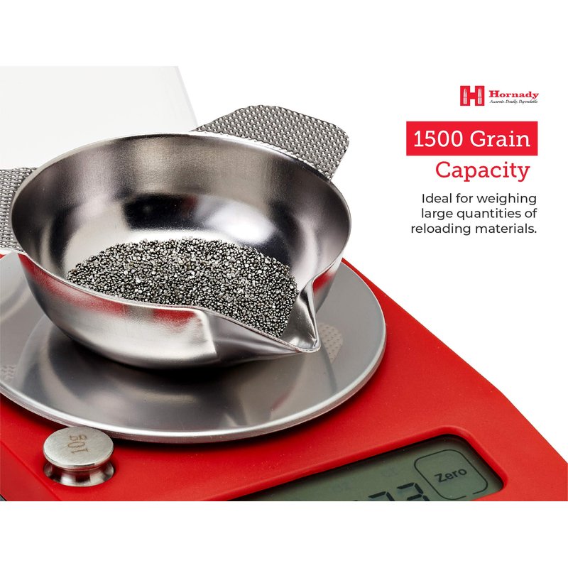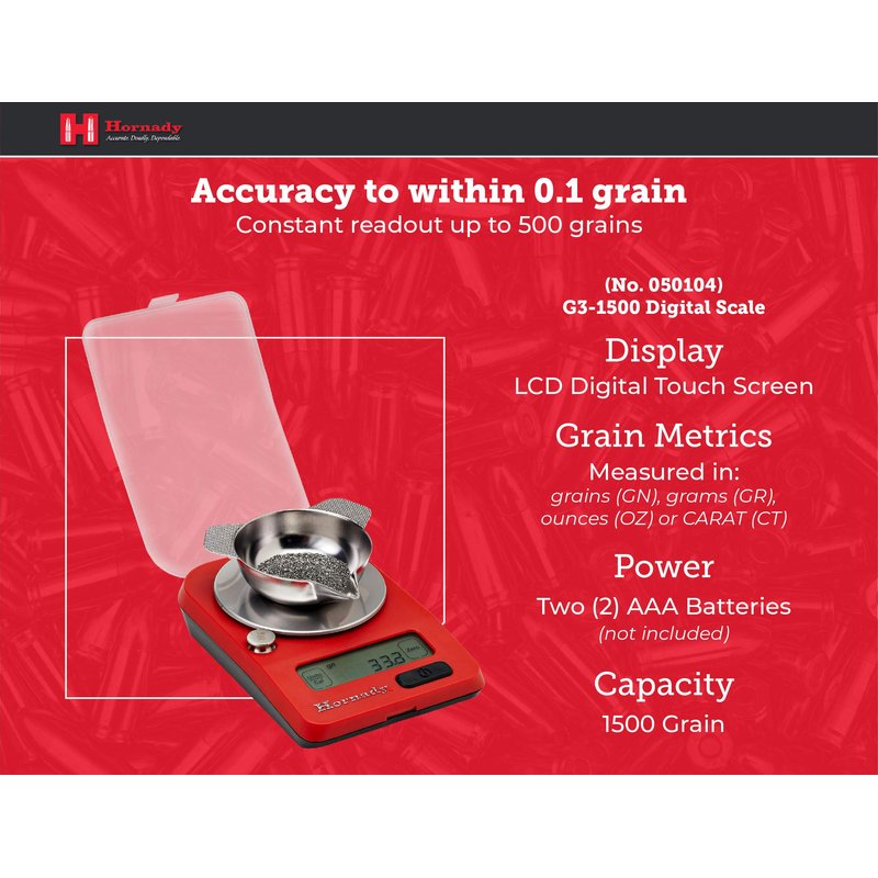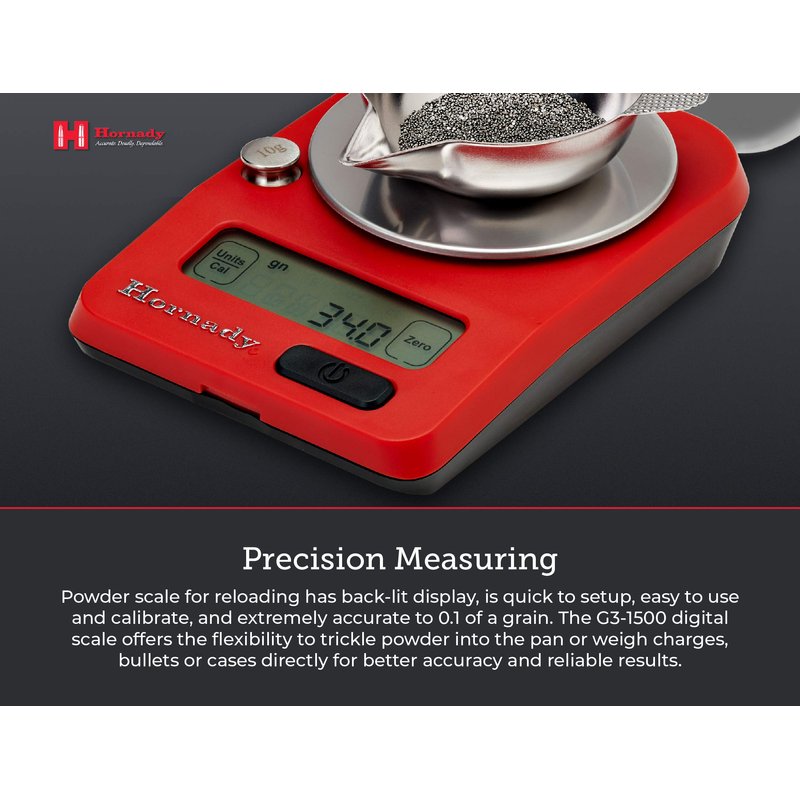 - Perfect Addition to Your Reloading Bench - the Hornady G3-1500 Digital Powder Scale 050104 is a portable, battery operated scale to help handload your own ammunition. It features a precision load cell with 1/10th grain accuracy and constant readout up to 500 grains, offering the flexibility to trickle powder into the pan or weigh charges, bullets or cases directly