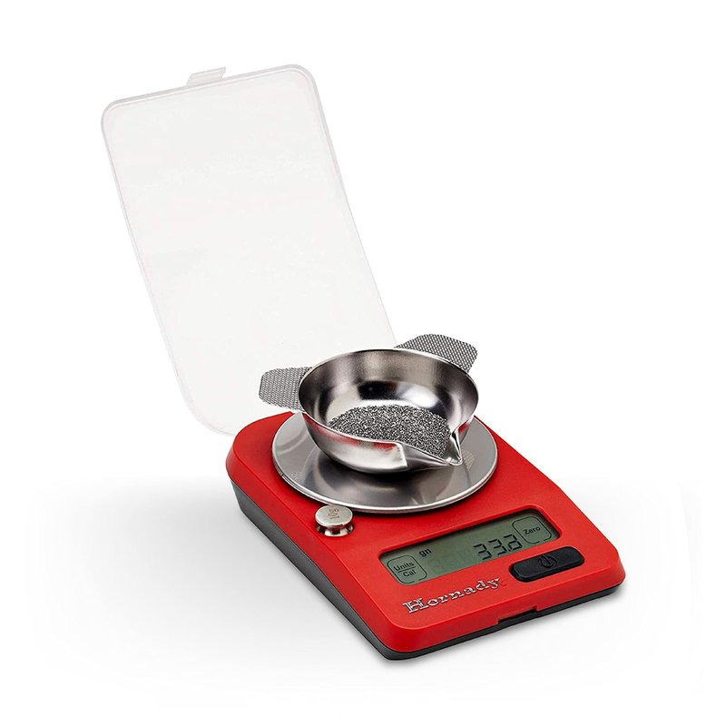 - For the Reloading Enthusiast - enjoy quick and easy calibration with this precision instrument. This Hornady electronic scale is designed with a small, compact footprint so it takes up less space. Requires two AAA batteries (not included). Includes 10 gram calibration weight, powder scale pan, draft cover, and LCD touch screen display