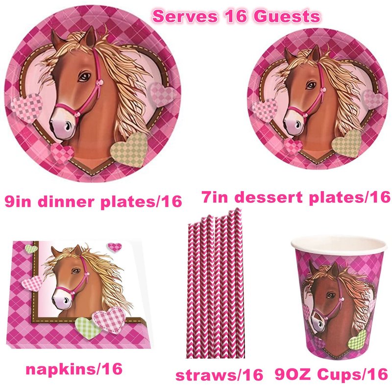 - Service for 16 Guests: Horse party supplies tableware including 16 9 inch Horse paper plates,16 7 inch Horse paper plates ,16 napkins ,16 Horse cups,16 straws,total 80pcs Serves 16 Guests