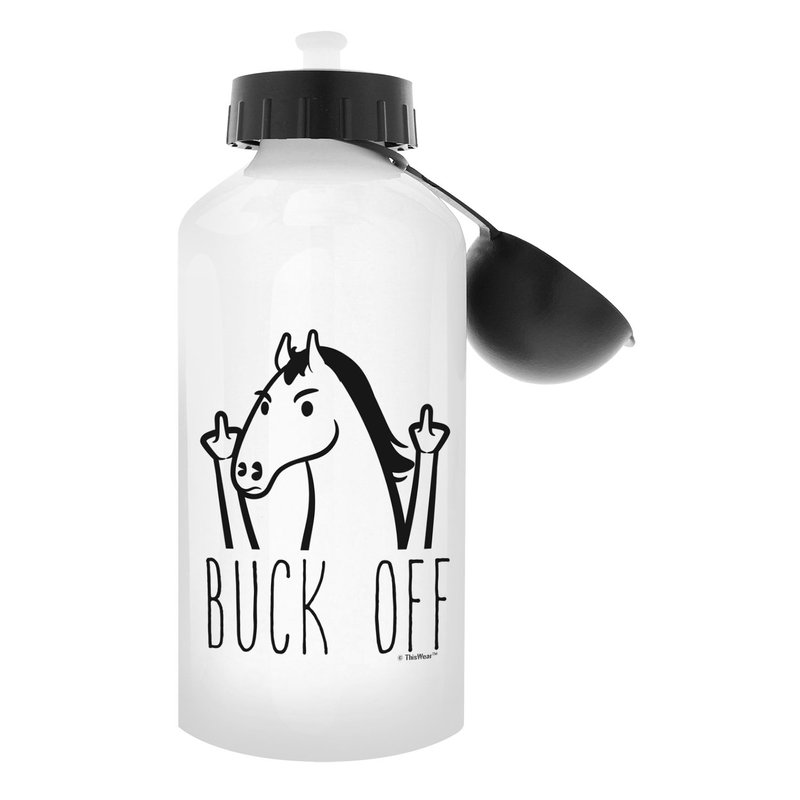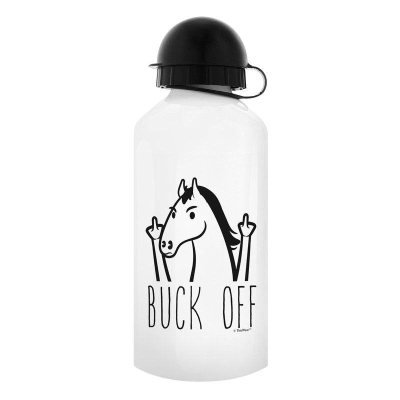 Buck off middle finger water bottles make excellent funny gifts. Funny water bottles are perfect gifts for women and men. This white aluminum water bottle holds 18 ounces of hot or cold liquid, and includes both a carabiner clip screw-top and a sports top for your convenience. This aluminum water bottle is a perfect travel size bottle for taking to sporting events, enjoying outdoor activities, or keeping hydrated at the office. The convenient size makes this portable water bottle a perfect water bottle for women, water bottle for men.. In addition to bottled water, this lightweight water bottle is perfect for holding ice cubes. The imprinted design will display on both sides of the water bottle as pictured. The premium full color sublimation imprint creates a vibrant, long lasting, and lead-free design. Handwashing is recommended.