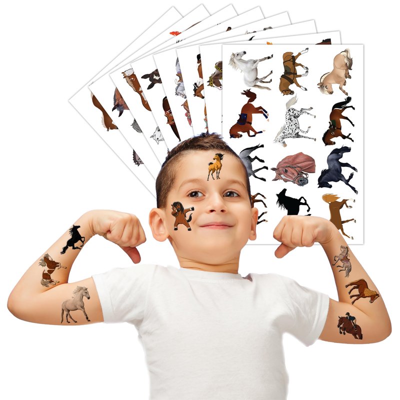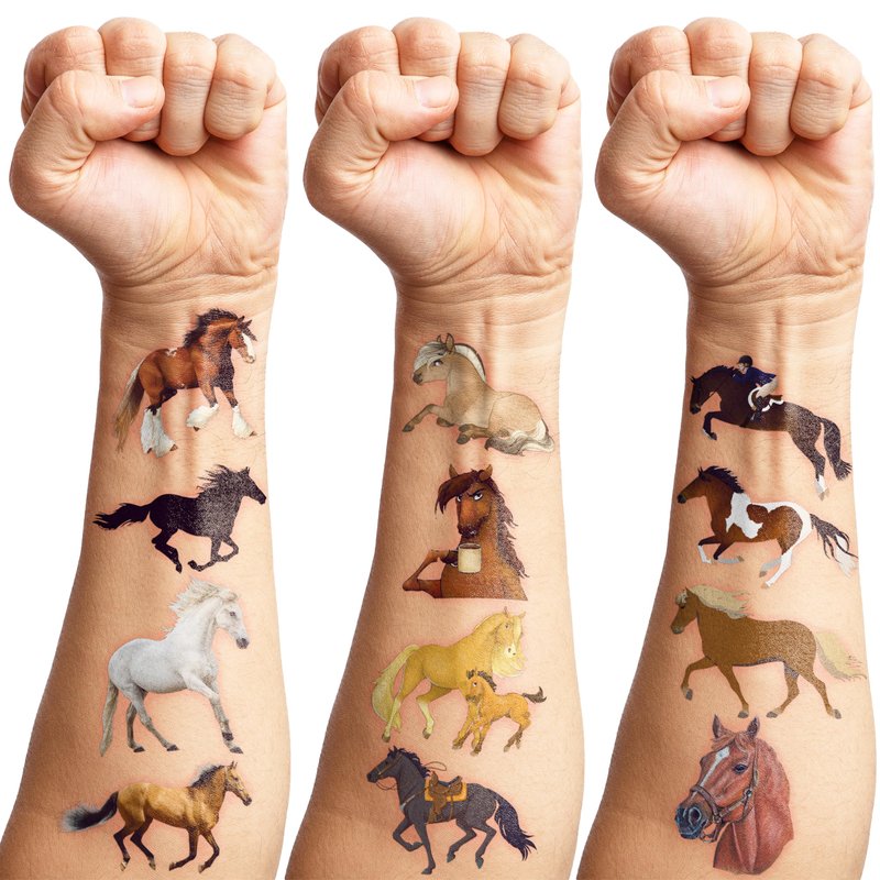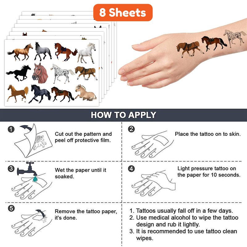 - 🐴【PERFECT TATTOOS FOR THEMED HORSE DECORATIONS】: Horse tattoos pertaining to our popular collection will accommodate children’s expectations that they always look forward to having them at Birthday parties, Christmas, and special celebrations. Each tattoos set covers 8 sheets in total with 96 Pcs. The size of each tattoo sticker is 6.1*3.1 inches, one size fit for adults to kids. The numerous formed horse tattoos designed to different styles promising to develop the cute beauty for parties