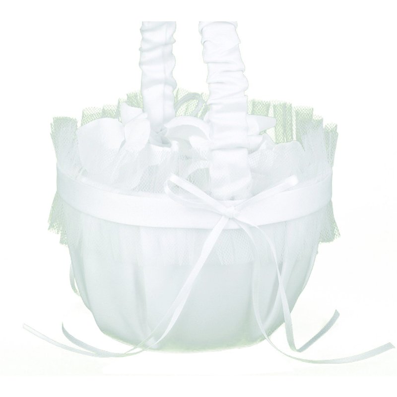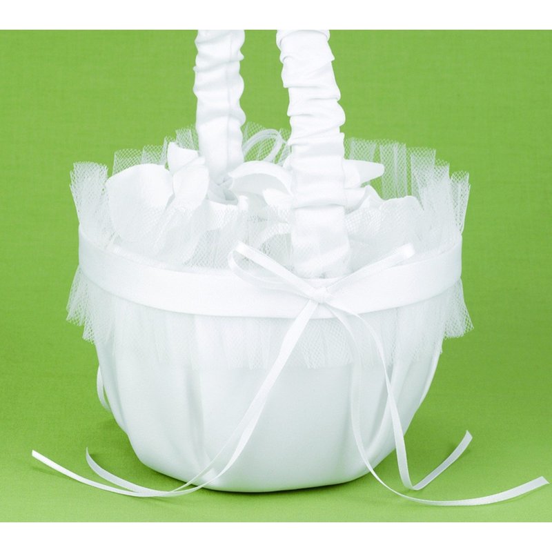 - White satin basket with white satin band and bow, and a white tulle ruffle