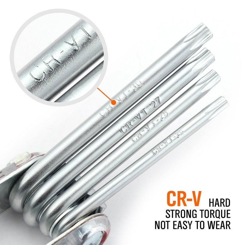 - Tamper Resistant Star Key Set Crafted with premium chrome vanadium steel, and each star tool folds neatly into the handle for quick, easy access.