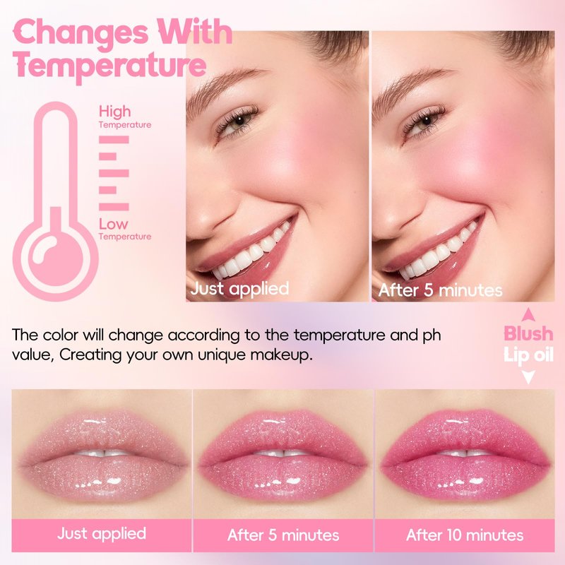 - 【Suitable for All Skin Tones】No matter what kind of skin tone you have, the color change lip oil blush set can be adjusted according to your personal PH to create a natural and healthy glow, brighten your skin tone, and create a youthful and refreshing makeup look.