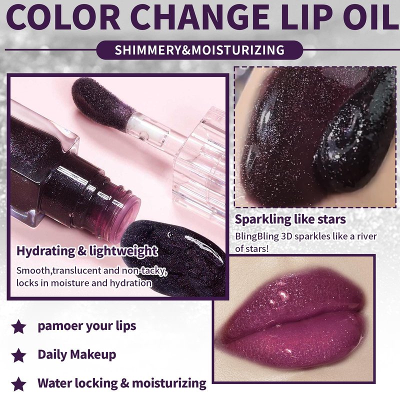 - 【Black Glitter Color Changing Lip Oil】This lip oil reacts to your skin's natural pH. The innovative color-changing formula changes color when applied to the lips depending on temperature, pH and other factors, bring your lip a unique look.
