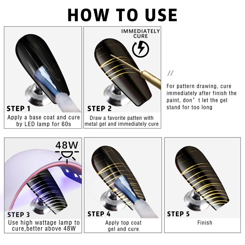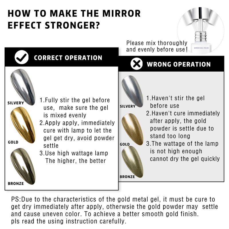 - 【Warm Tips】Mirror Metallic Nail Polish needs to be cured with a 48w or higher power UV/LED for 90-120 seconds. Due to the characteristics of gold metallic nail polish, it must be cured immediately after application. Metallic Nail Gel is thicker and tends to sink over time, so please stir well before use. If you have any questions about this product, please feel free to contact us.