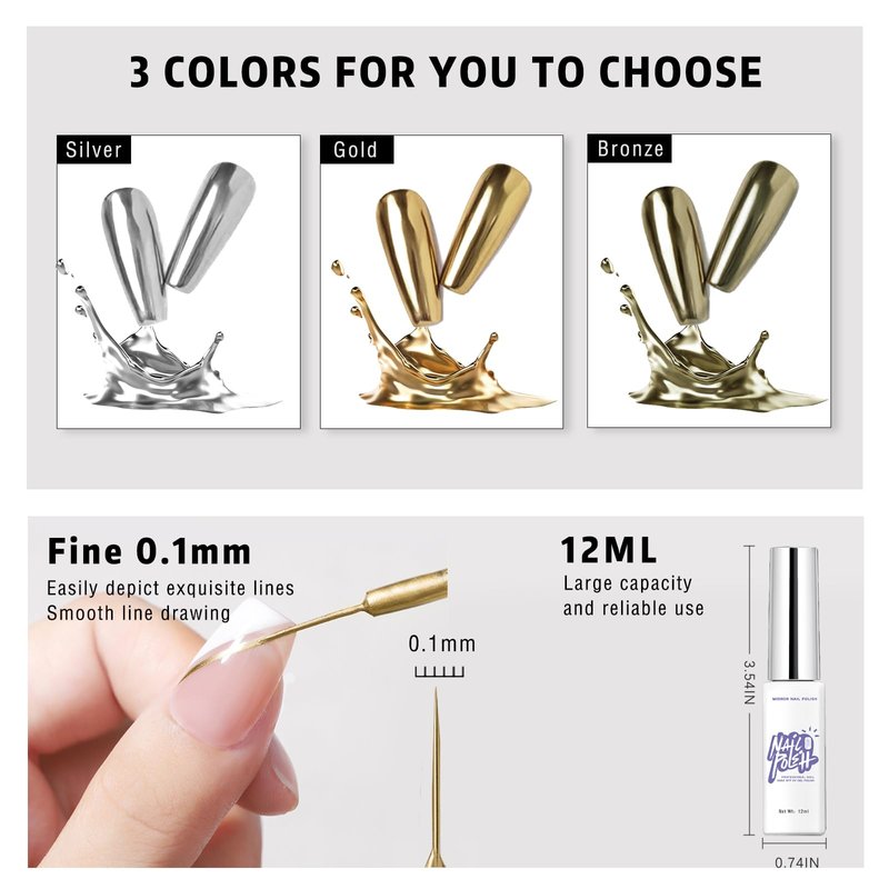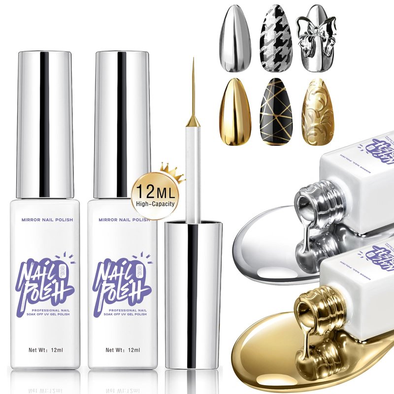 - 【Mirror Silver & Mirror Gold Gel Liner Polish Set】Our chrome metallic painting gel set includes 2 pieces of painting gel nail polish (gold and silver) with built-in fine brush can be used to outline the lines accurately and draw different patterns to create your own beautiful nail art designs.